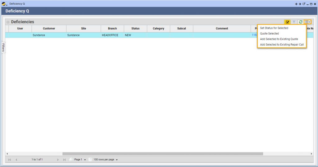 - Click on the grid extended menu and select “Quote Selected.” Note that deficiencies may be added to an existing quote or an existing repair call from the same menu