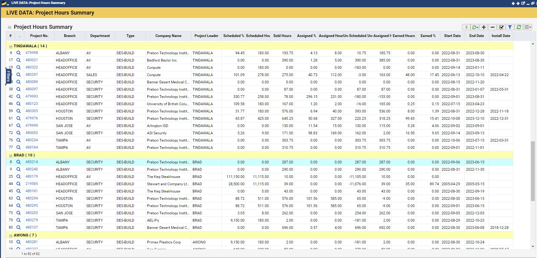 This report shows a project by project breakdown of hours Sold, Scheduled, Assigned and Earned on each Active project for the selected criteria.